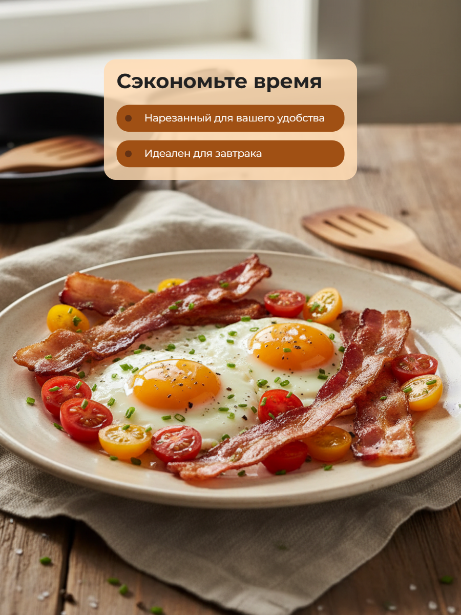 Бекон варено-копченый (в/к) в нарезке от мясоперерабатывающего завода «Ремит» — это варено-копченый бекон из свиной грудинки.