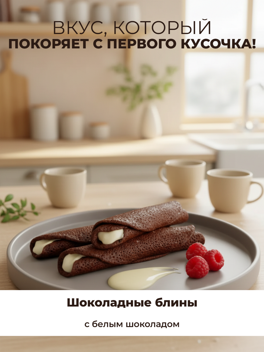 Тонкие шоколадные блины имеют пористую текстуру, насыщенный вкус какао, белый шоколад добавляет сладость и сливочные ноты.