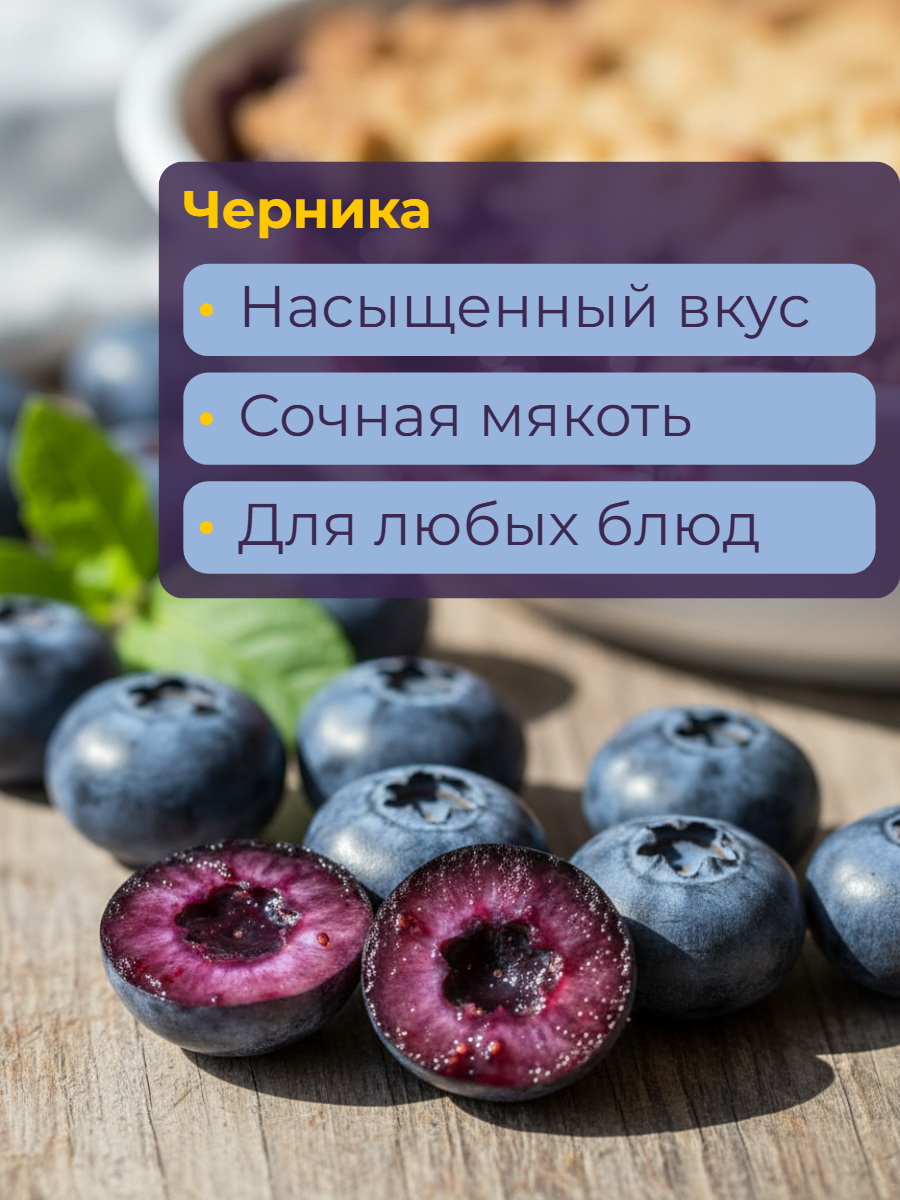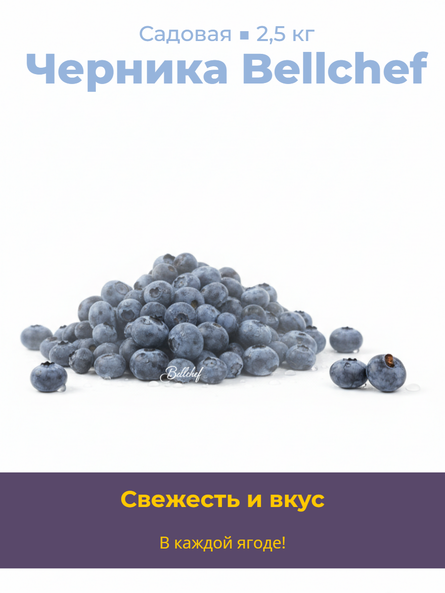 Под брендом Bellchef выпускается замороженная садовая черника в упаковках по 2,5 кг. Продукт представляет собой отборные цельные ягоды, подвергнутые шоковой заморозке для сохранения вкуса и питательных свойств.