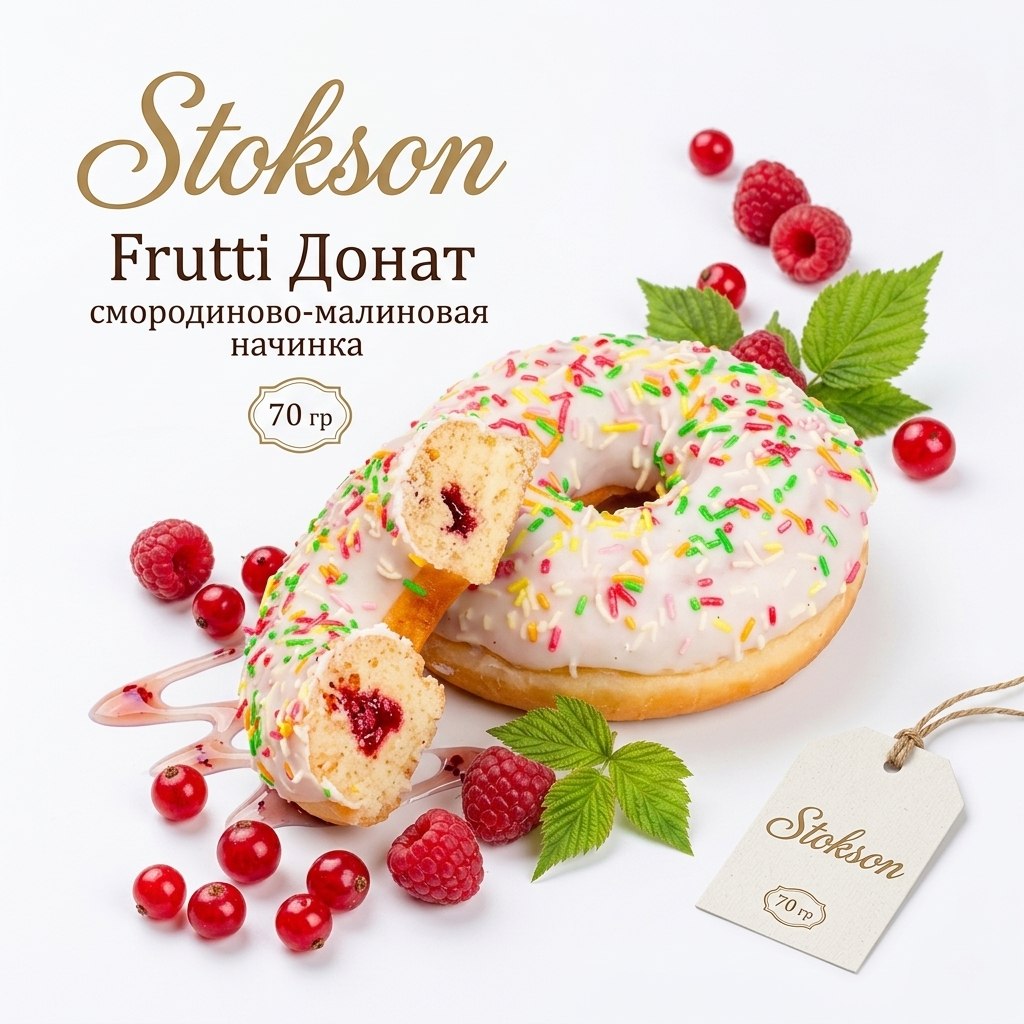 Воздушное дрожжевое тесто обжаривается до равномерной золотистой корочки и наполняется сочной ягодной начинкой на основе малины и черной смородины, сверху покрыто белой глазурью с разноцветной посыпкой. Донат имеет круглую форму, мягкую с легкой упругостью текстуру, ягодный вкус с легкой кислинкой и аромат свежей выпечки.