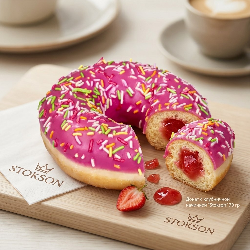 Воздушное дрожжевое тесто обжаривается до равномерной золотистой корочки и наполняется клубничной начинкой, сверху покрыто розовой глазурью с разноцветной посыпкой. Донат имеет круглую форму, мягкую с легкой упругостью текстуру, сладкий вкус с ягодной кислинкой и аромат свежей выпечки.