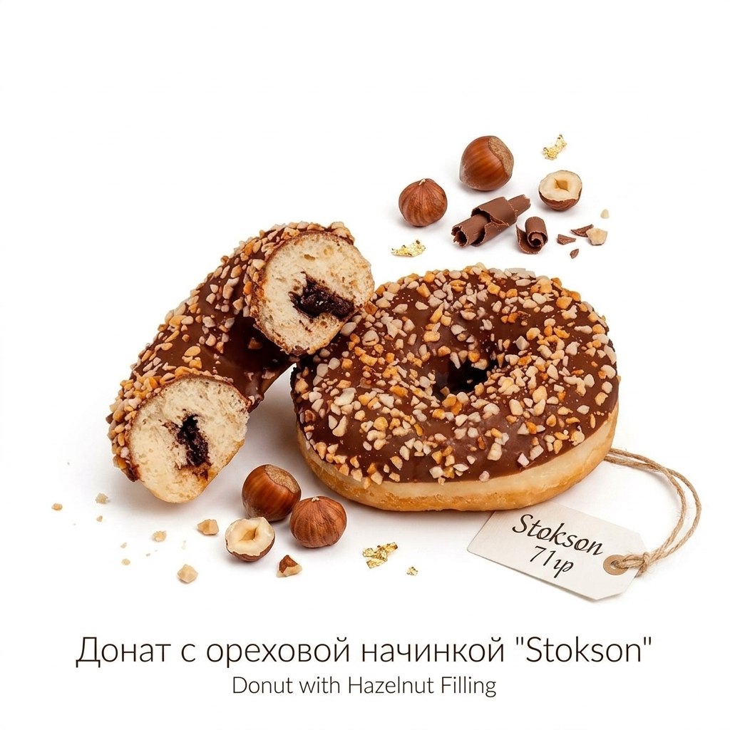 Воздушное дрожжевое тесто обжаривается до равномерной золотистой корочки и наполняется густой начинкой из фундука, сверху покрыто шоколадной глазурью с посыпкой из дробленого арахиса. Донат имеет круглую форму, мягкую с легкой упругостью текстуру, сладкий ореховый вкус и аромат свежей выпечки.