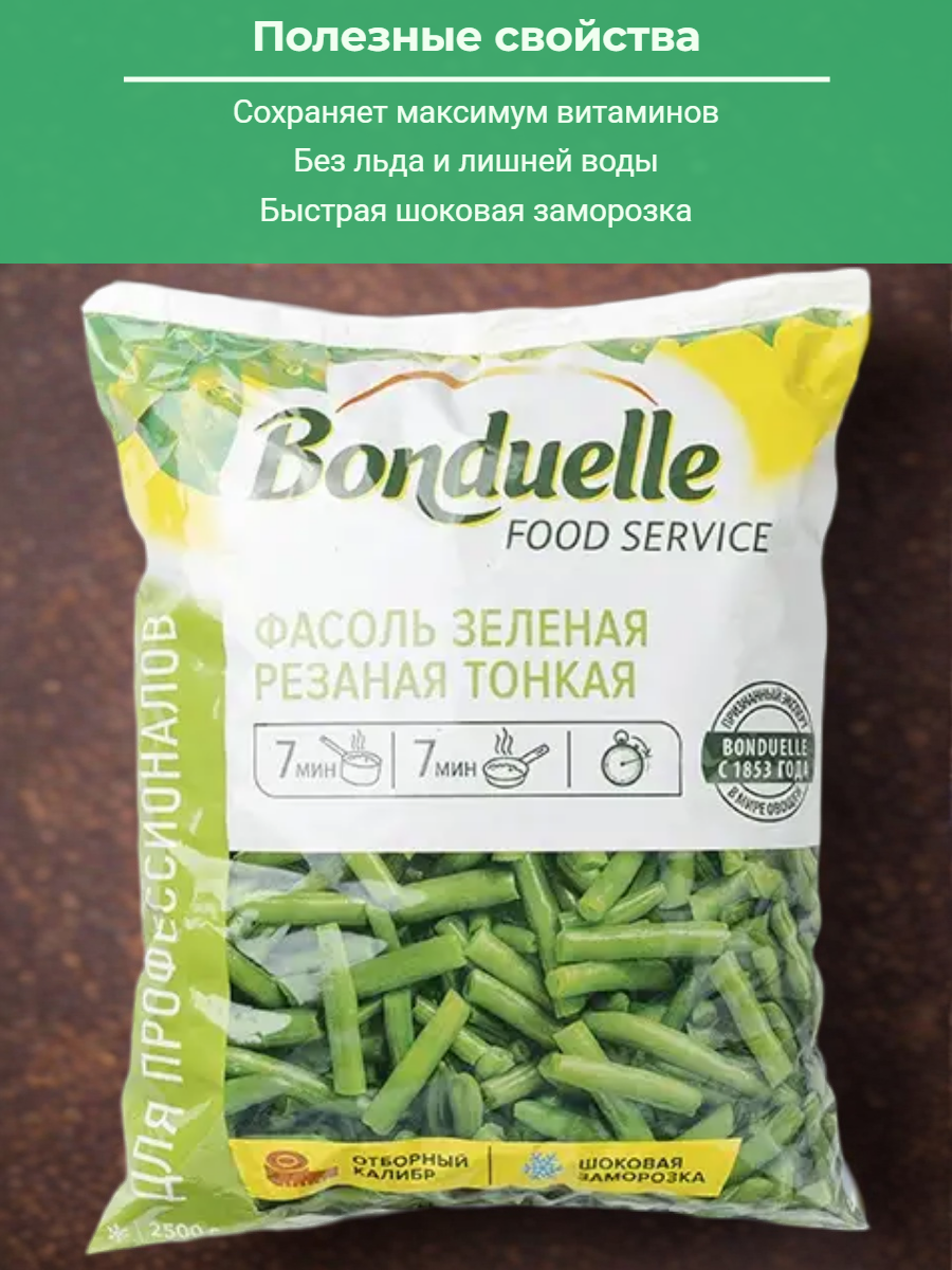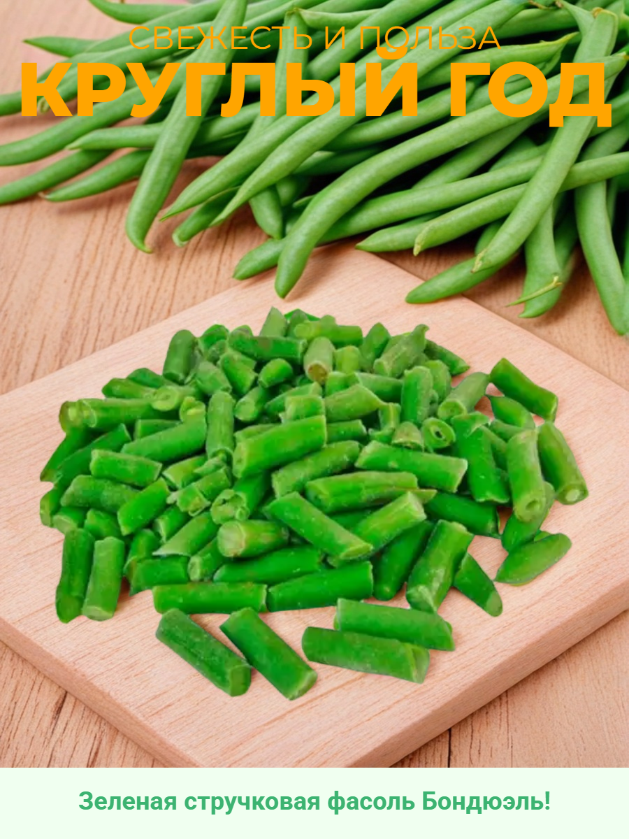 Хрустящая стручковая фасоль очищена, откалибрована и нарезана ровными кусочками, имеет яркий зеленый цвет, сладковатый вкус, остается упругой после термической обработки, не требует длительной готовки и размораживания.