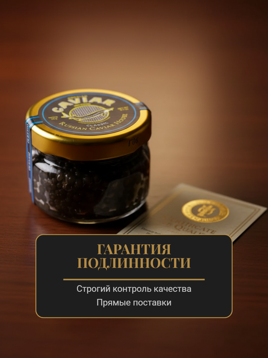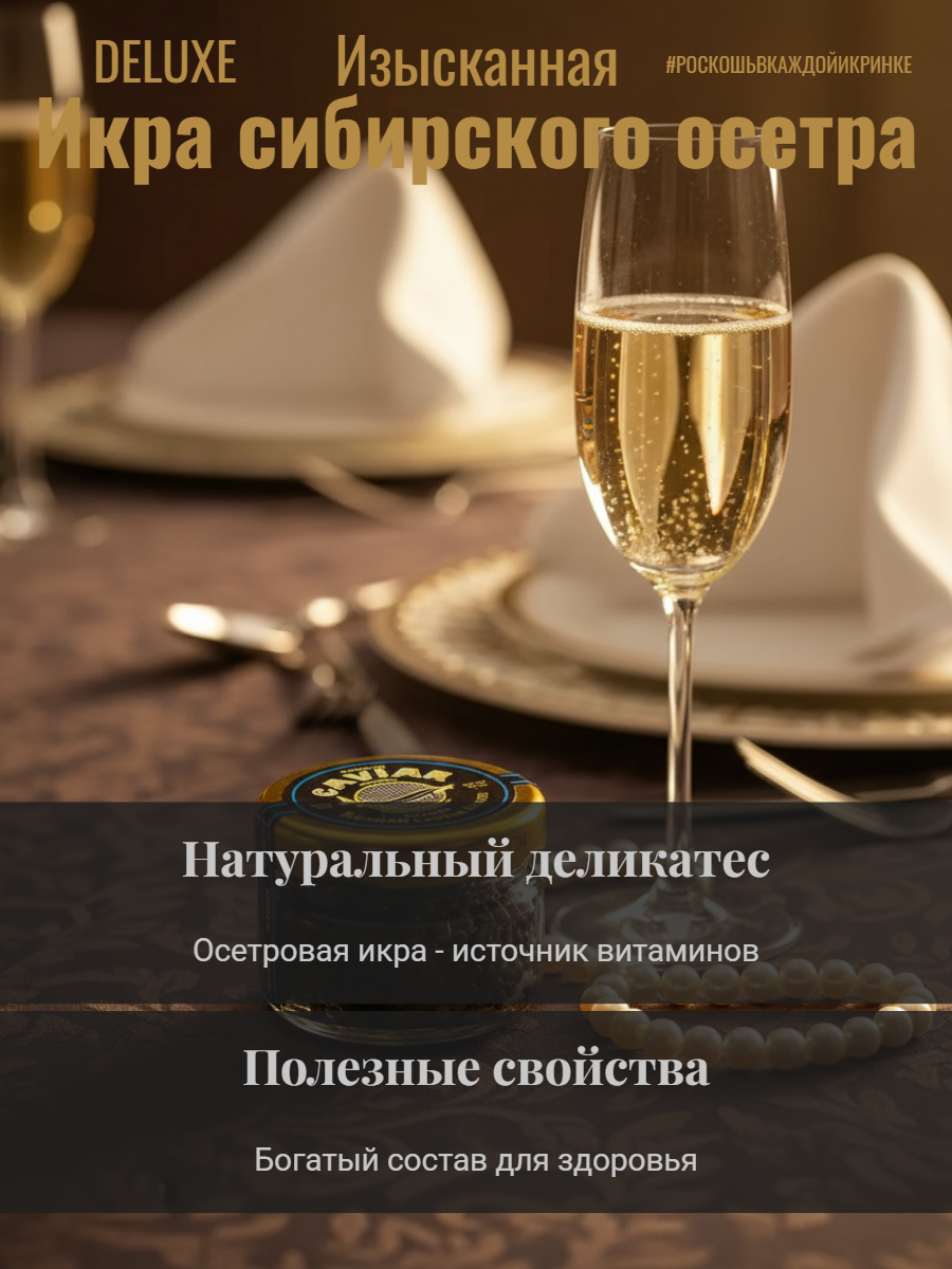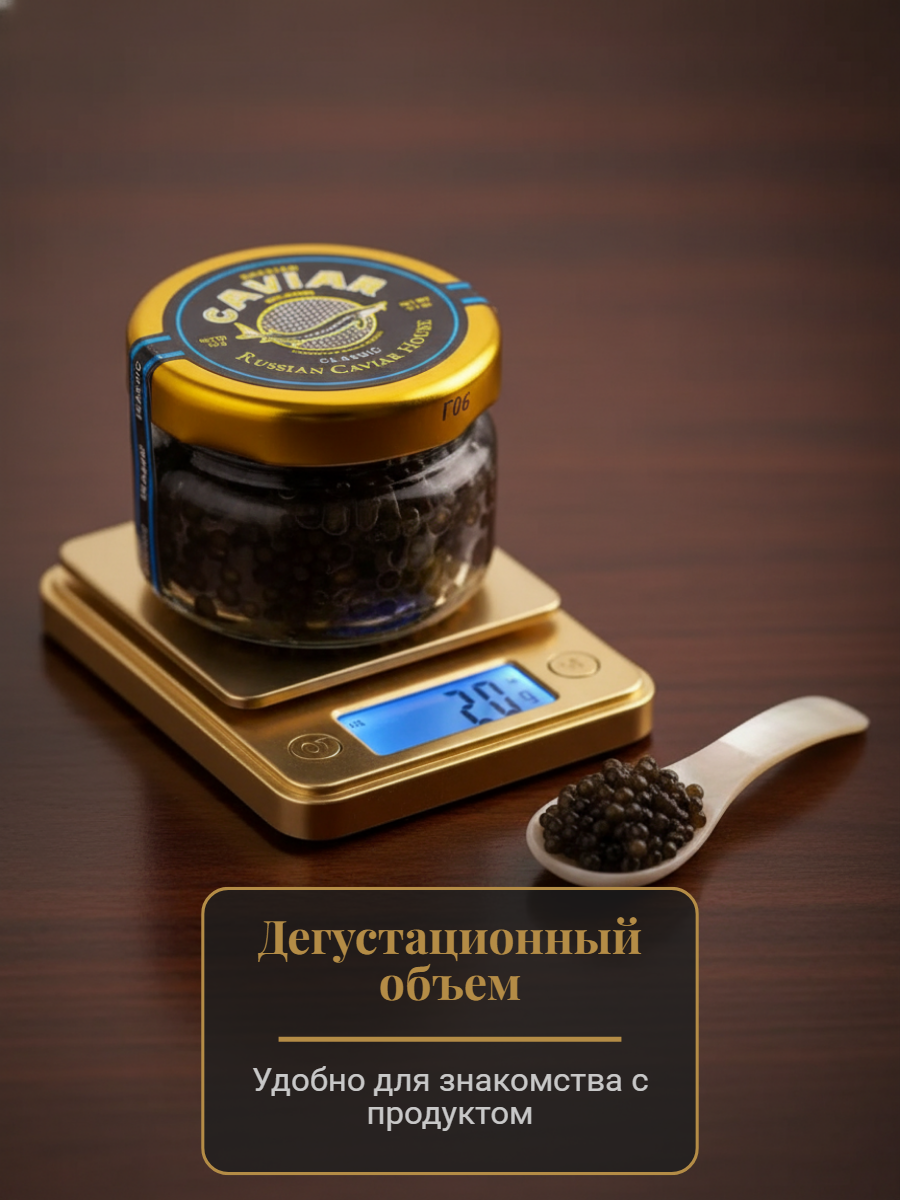 Икру получают от молодых особей русских осетров. Икра зернистая непастеризованная, среднего размера (2 мм), темно-серого цвета. Текстура нежная и упругая, аромат свежий без рыбного оттенка, вкус сливочно-ореховый с морскими и йодистыми нотами. Икринки покрыты тонкой оболочкой, которая лопается при перемешивании или во рту, высвобождая икорный сок.