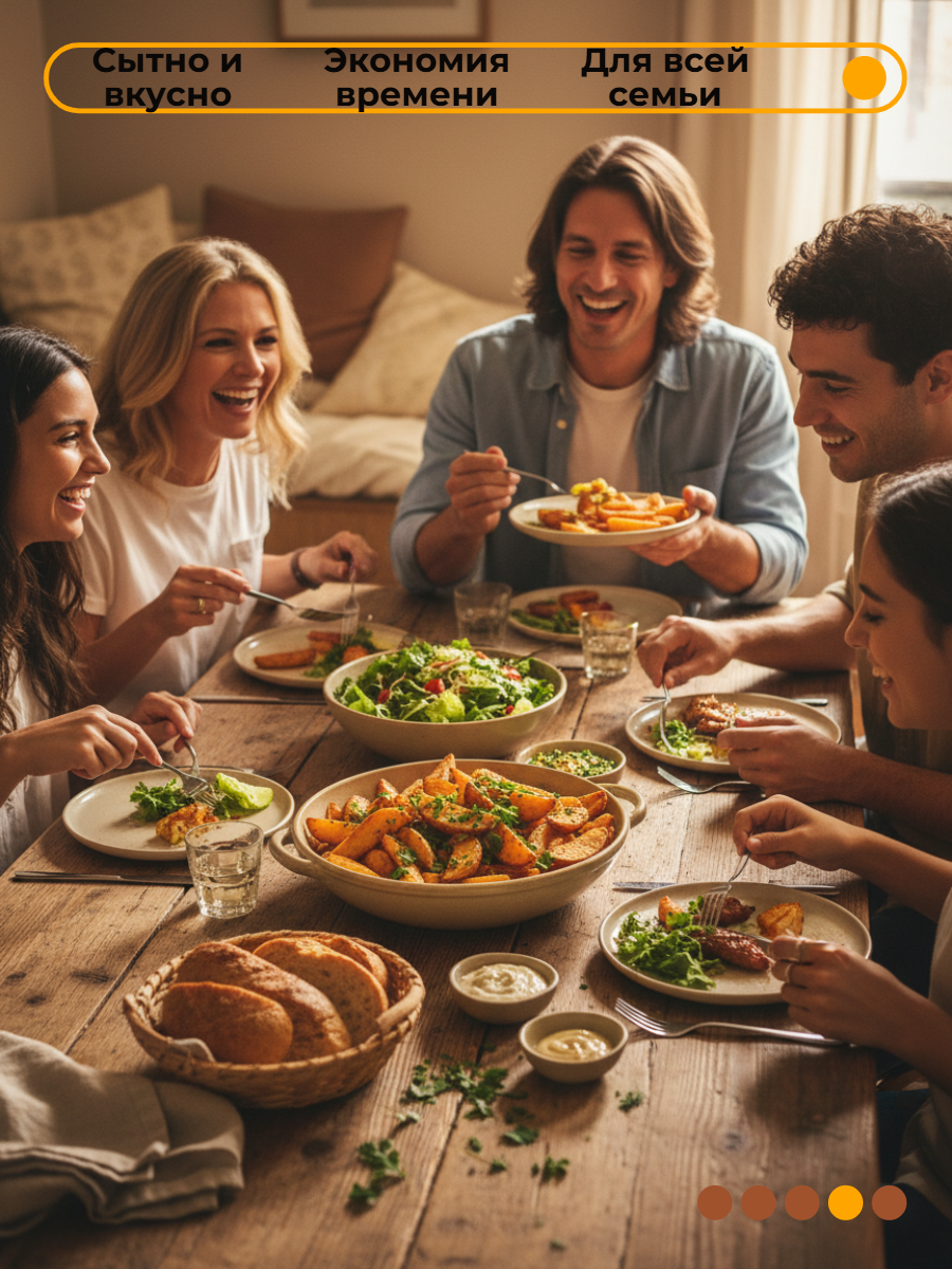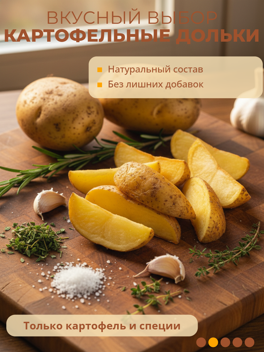 Ровные картофельные дольки с натуральным вкусом и нежной текстурой покрываются хрустящей корочкой в процессе приготовления.