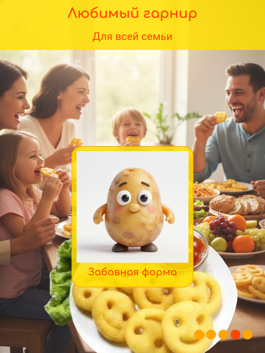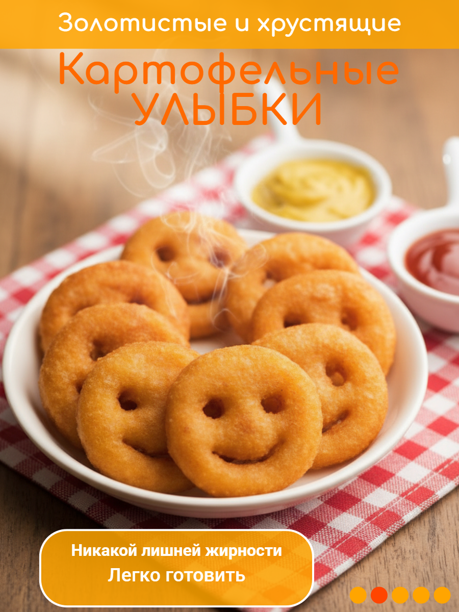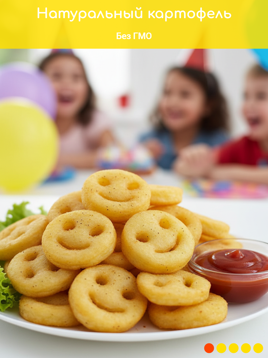 Улыбки сформированы из картофельной массы с однородной структурой и вырезаны фигурной формой. Картофельные улыбки имеют хрустящую золотистую корочку, насыщенный картофельный вкус и аппетитный аромат. Не требует разморозки перед приготовлением.