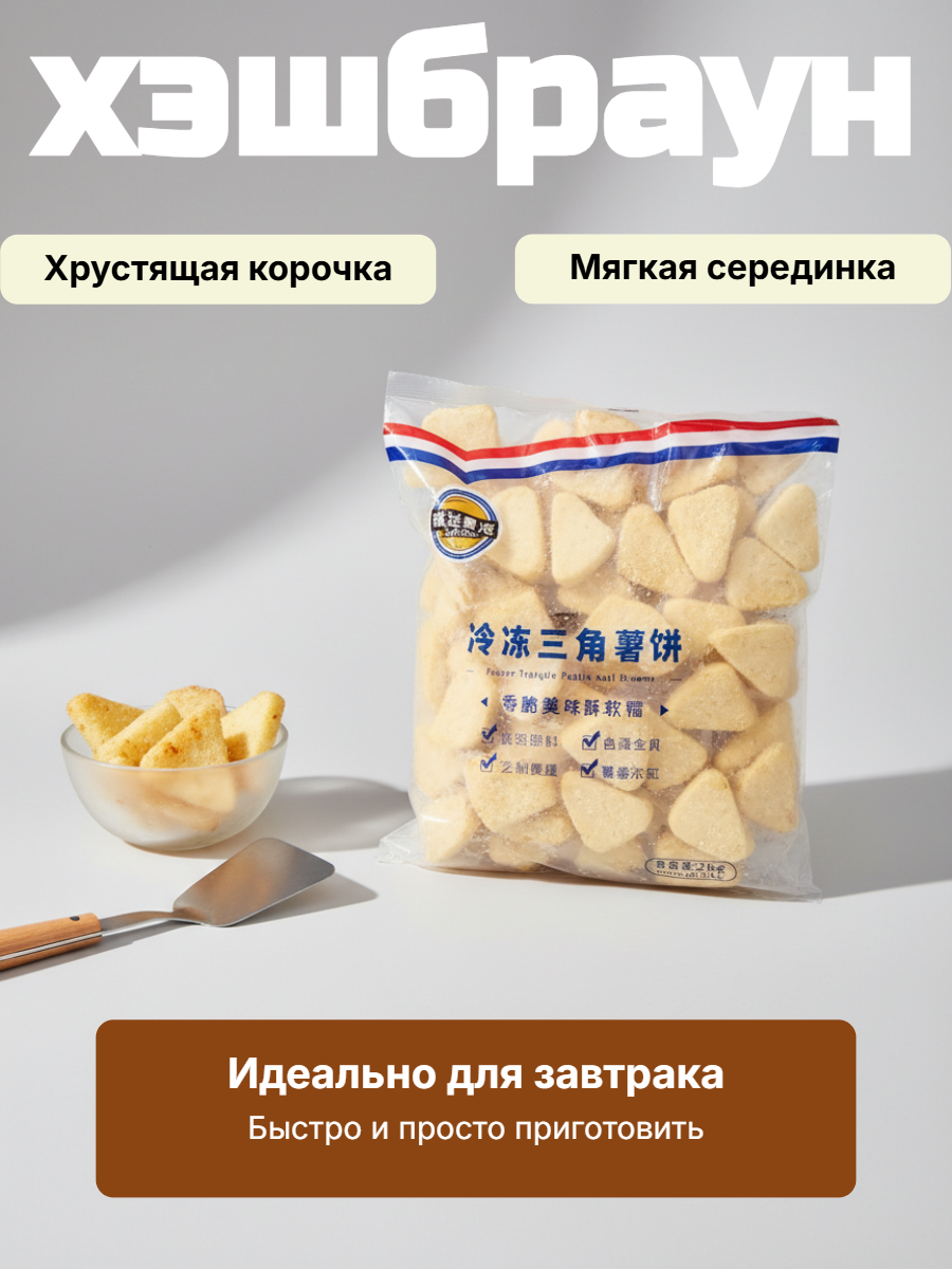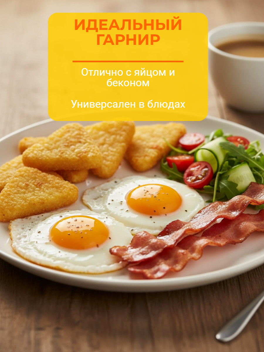 Картофельный хашбраун имеет треугольную форму, снаружи румяную хрустящую корочку, внутри нежный тертый картофель, аппетитный овощной аромат с хлебными нотами.