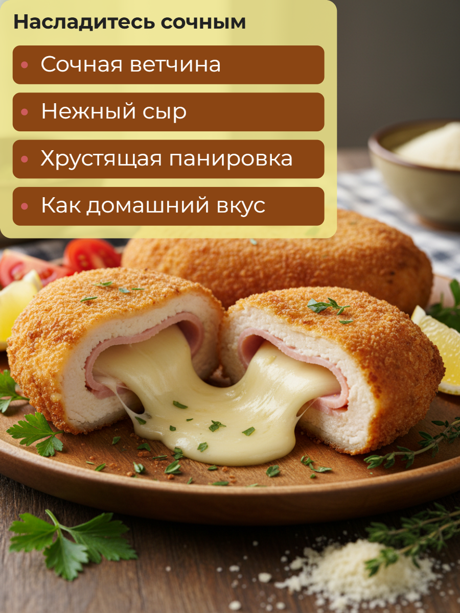 Замороженные полуфабрикаты Кордон блю от Мираторг с начинкой из ветчины и сыра, в панировке, готовые к термической обработке.