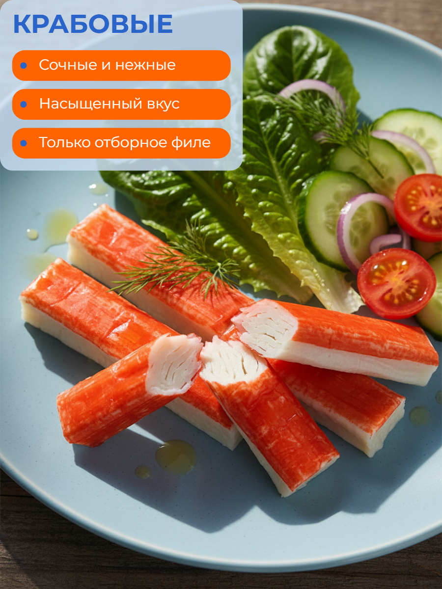 Крабовые палочки изготавливаются на основе рыбного фарша сурими. Палочки имеют нежную, сочную и мягкую текстуру, слоистую, волокнистую структуру, сладковатый вкус с легкими солеными нотами и морской аромат.