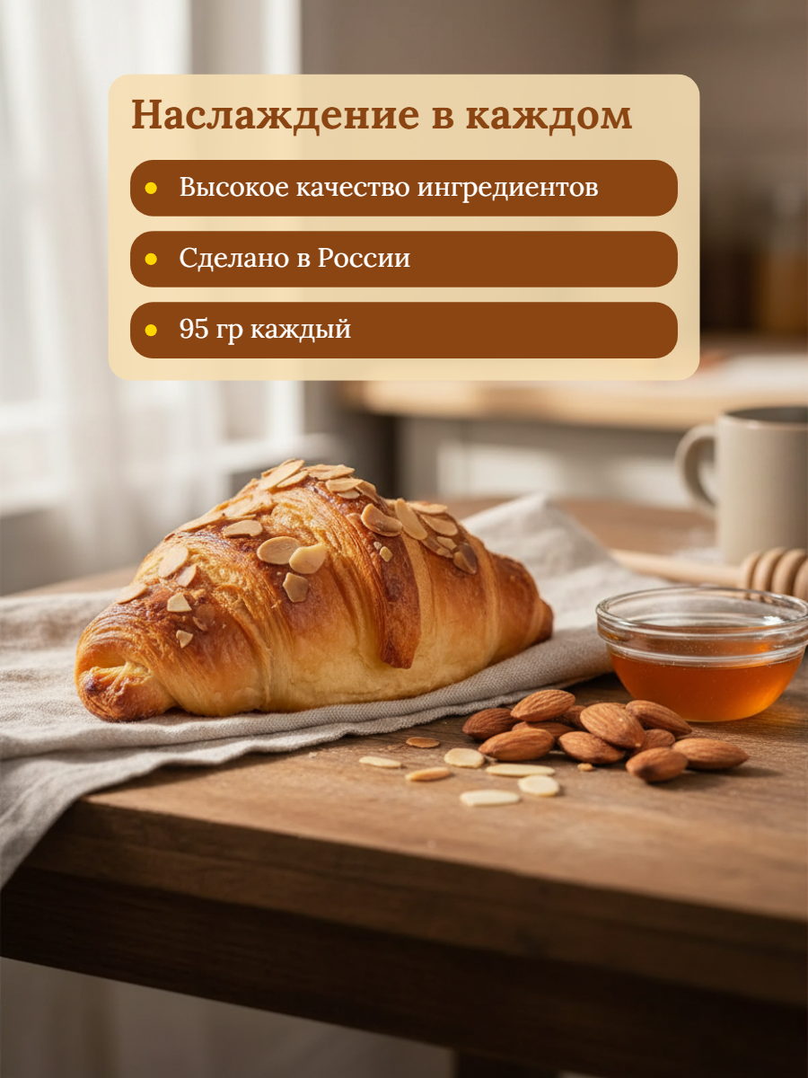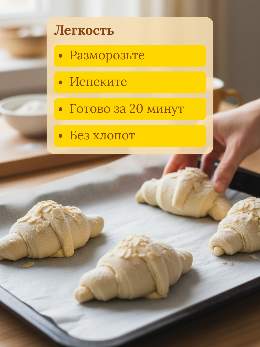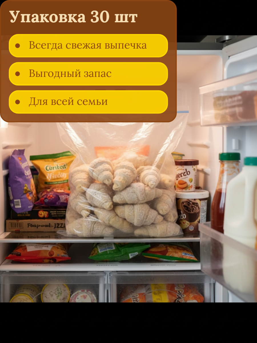 Круассаны от бренда "Десерт Фентези" подарят вам истинное удовольствие! Они созданы из высококачественных ингредиентов по особой технологии замораживания (-18…-22°C), что позволяет сохранить свежесть и вкус длительное время. Производятся в России, соответствуют строгим стандартам качества. Готовьте легко и быстро – просто подогрейте перед подачей.