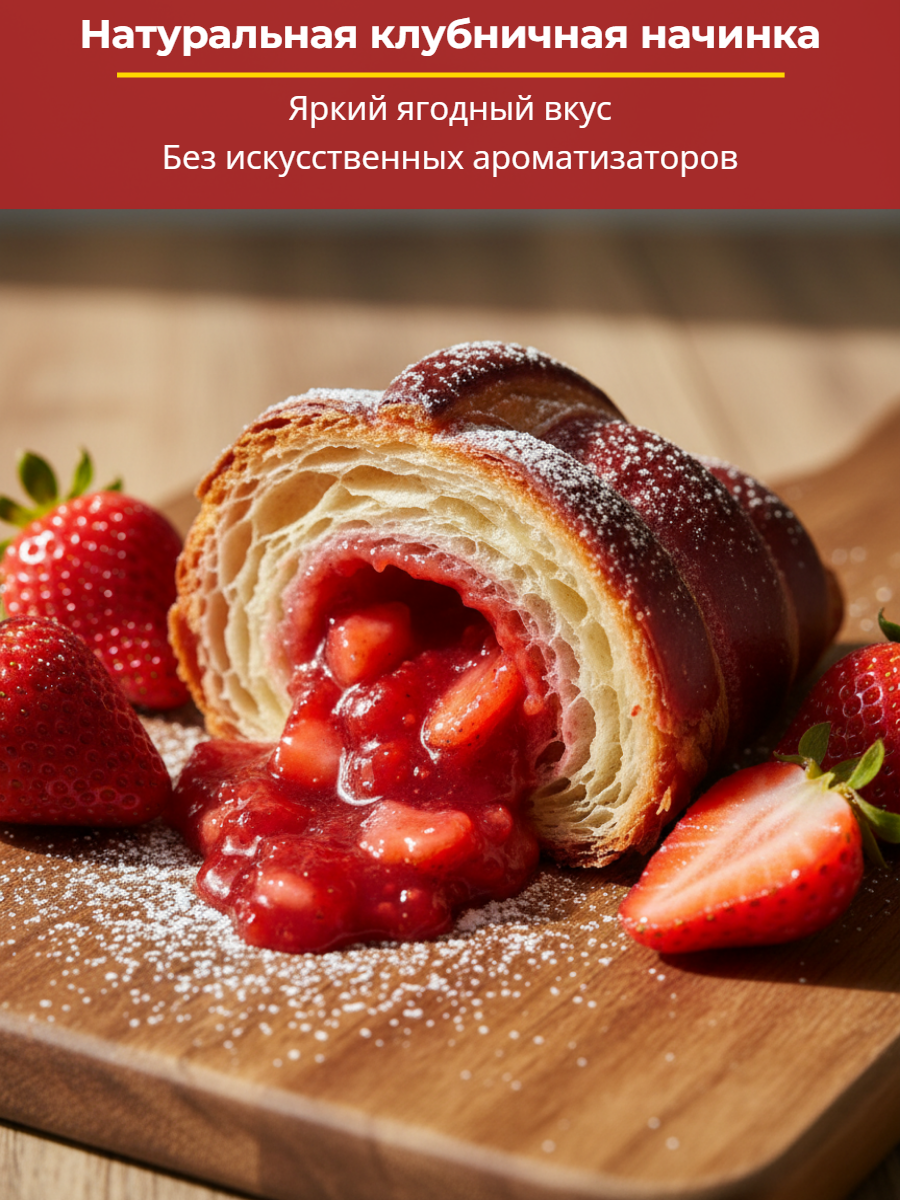 Мука пшеничная хлебопекарная высшего сорта, начинка Клубника (клубника свежезамороженная, сахар, вода, загустители: крахмал кукурузный, пищевая добавка: геллановая камедь E418), комплексная пищевая добавка краситель натуральный кармин мальтодекстрин, краситель кармины, ароматизатор натуральный Клубника, вода, маргарин масла растительные рафинированные дезодорированные, ароматизатор натуральный, сахар белый, меланж, дрожжи хлебопекарные прессованные, молоко сухое цельное, технологическое вспомогательное средство: улучшитель хлебопекарный пшеничная клейковина, эмульгатор Е472е, антиокислитель Е300, ферменты микробного происхождения альфа-амилаза и гемицеллюлаза, соль, краситель натуральный Кармин, глютен пшеничный, краситель натуральный Вишня мальтодекстрин, красители E150d, E120.
