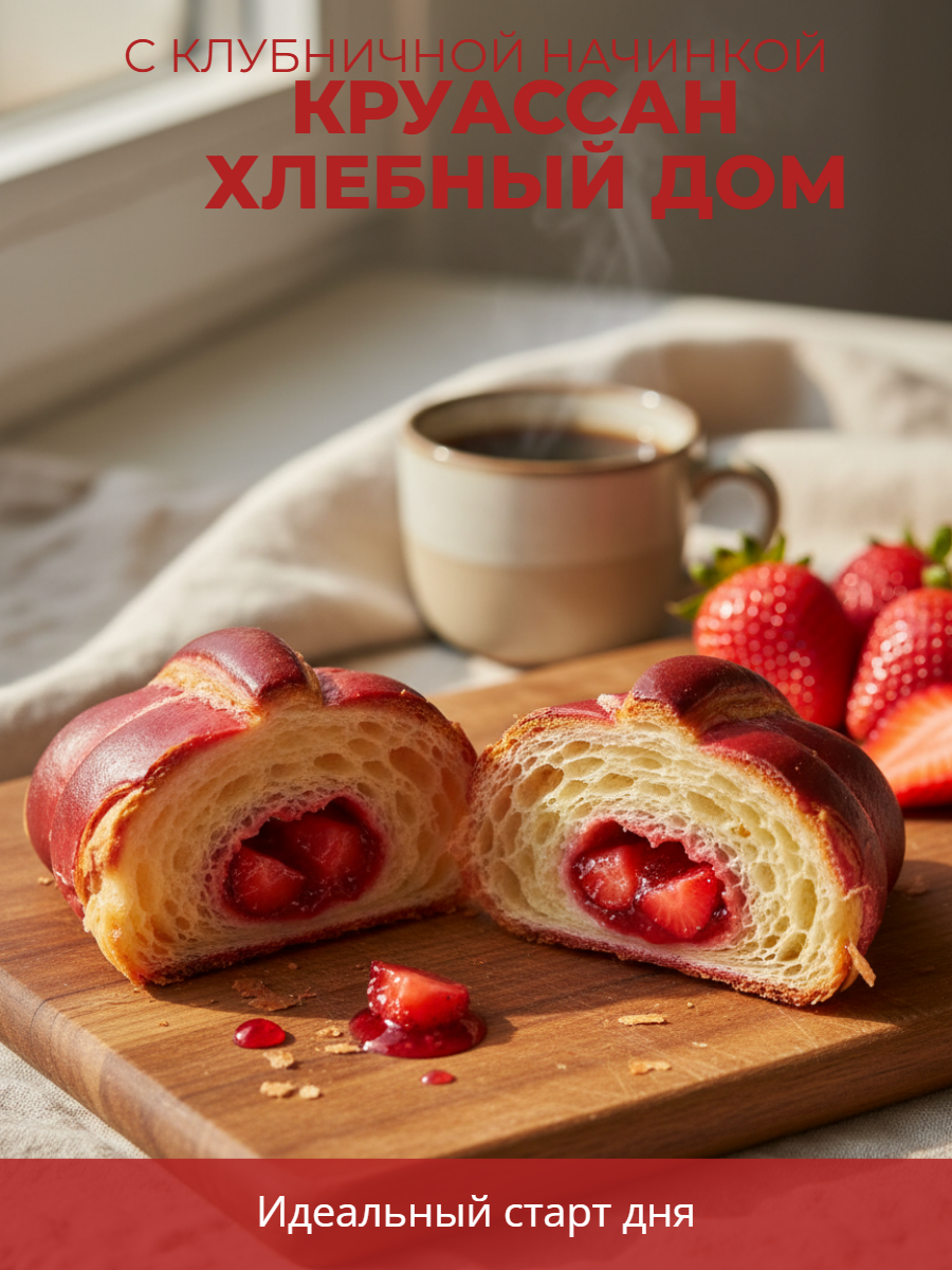 Круассан с клубничной начинкой Хлебный дом замороженный, 70г - двухцветный круассан из нежнейшего воздушного слоеного теста с большим количеством вкусной и натуральной клубничной начинки. Круассан имеет премиальный внешний вид за счет красивого скручивания слоев разноцветного теста в три витка. Конвертик из слоеного теста с клубничной начинкой. Он обладает восхитительным вкусом и идеально дополнит чашечку горячего чая. В удобной упаковке два вкусных франтика. Традиционная слоеная выпечка, приготовленная с добавлением клубники, яблока и ванили. Оригинальная рецептура и отборные ингредиенты делают вкус круассана незабываемым. Аппетитный десерт для всей семьи.