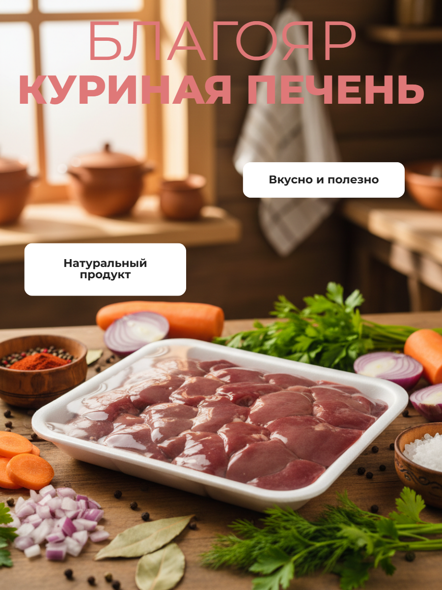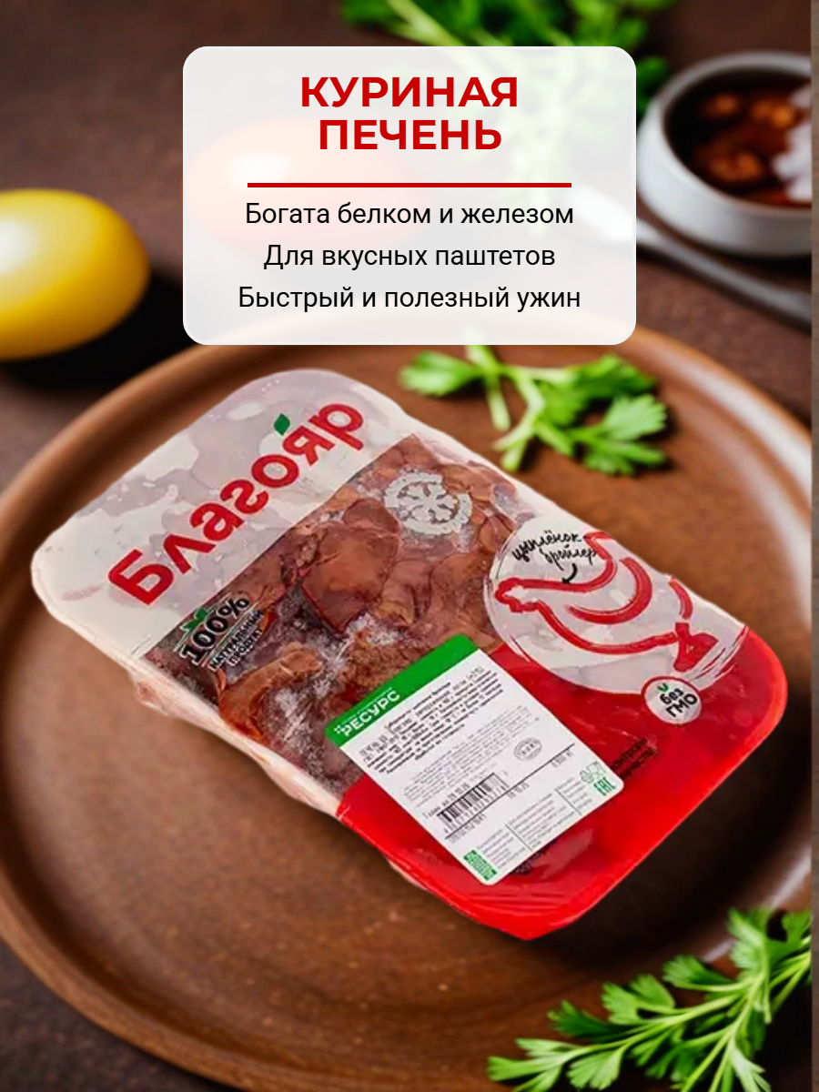 Отборная куриная печень, выращенная на экологически чистых фермах на натуральных зерновых кормах без стимуляторов роста. Печень очищена от желчных протоков, сосудов и внешней пленки.
