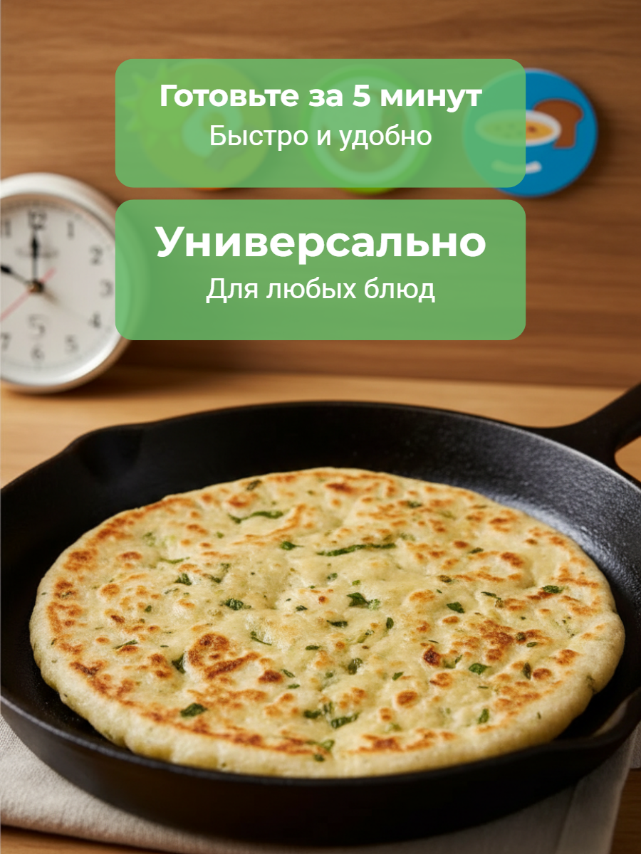 Изделие из тонких эластичных слоев теста, смазанных маслом с добавлением сушеного зеленого лука, имеет пикантный вкус с легкой солоноватостью и пряный аромат. После обжаривания лепешка снаружи приобретает хрустящую золотистую текстуру и внутри — слоистую, эластичную и мягкую. Лепешку необходимо обжарить на сухой, хорошо разогретой сковороде без добавления масла.