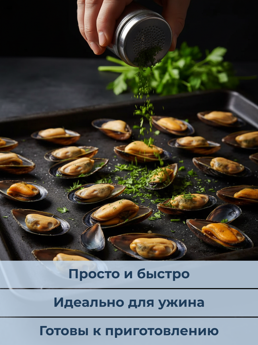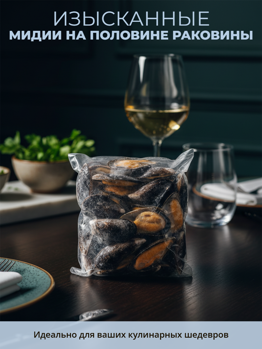 Варено-мороженные мидии имеют нежный сладко-солоноватый вкус, мягкую и сочную текстуру и ощутимый морской аромат. Мидии на половине раковины крупного размера.