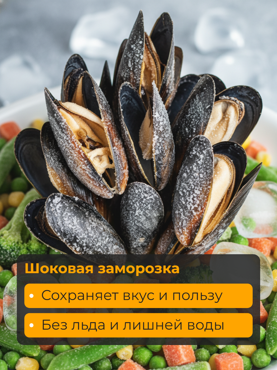 1. Мидии черноморские (Mytilus edulis), ледяная глазурь — обычно составляет от 7% до 10% (необходима, чтобы мясо не пересыхало при хранении).
