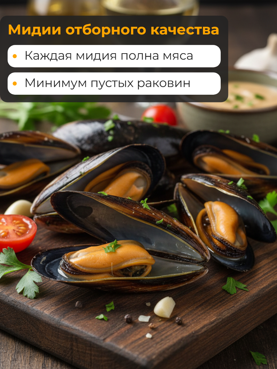 - Калибр (размер): 40/60 означает, что в 1 кг содержится от 40 до 60 целых ракушек. Это крупные мидии (длина створки около 4–5 см), которые ценятся за высокое содержание мяса.