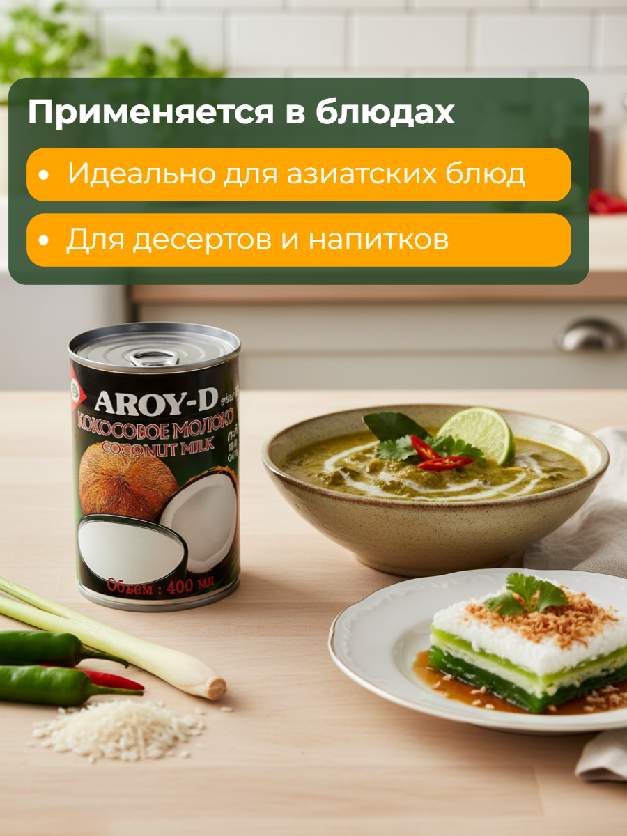 Благодаря своему натуральному вкусу, кокосовое молоко Aroy-D прекрасно сочетается с десертами и напитками.