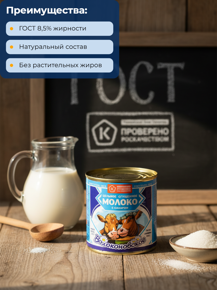 Молоко цельное сгущенное с сахаром вареное «Волоконовское» (8,5% жирности, 370 г) — это высококачественный молочный продукт, изготовленный по ГОСТ 33921-2016 (ранее ГОСТ Р 54540-2011). Продукт производится Волоконовским консервным комбинатом в Белгородской области и не содержит заменителей молочного жира (БЗМЖ).