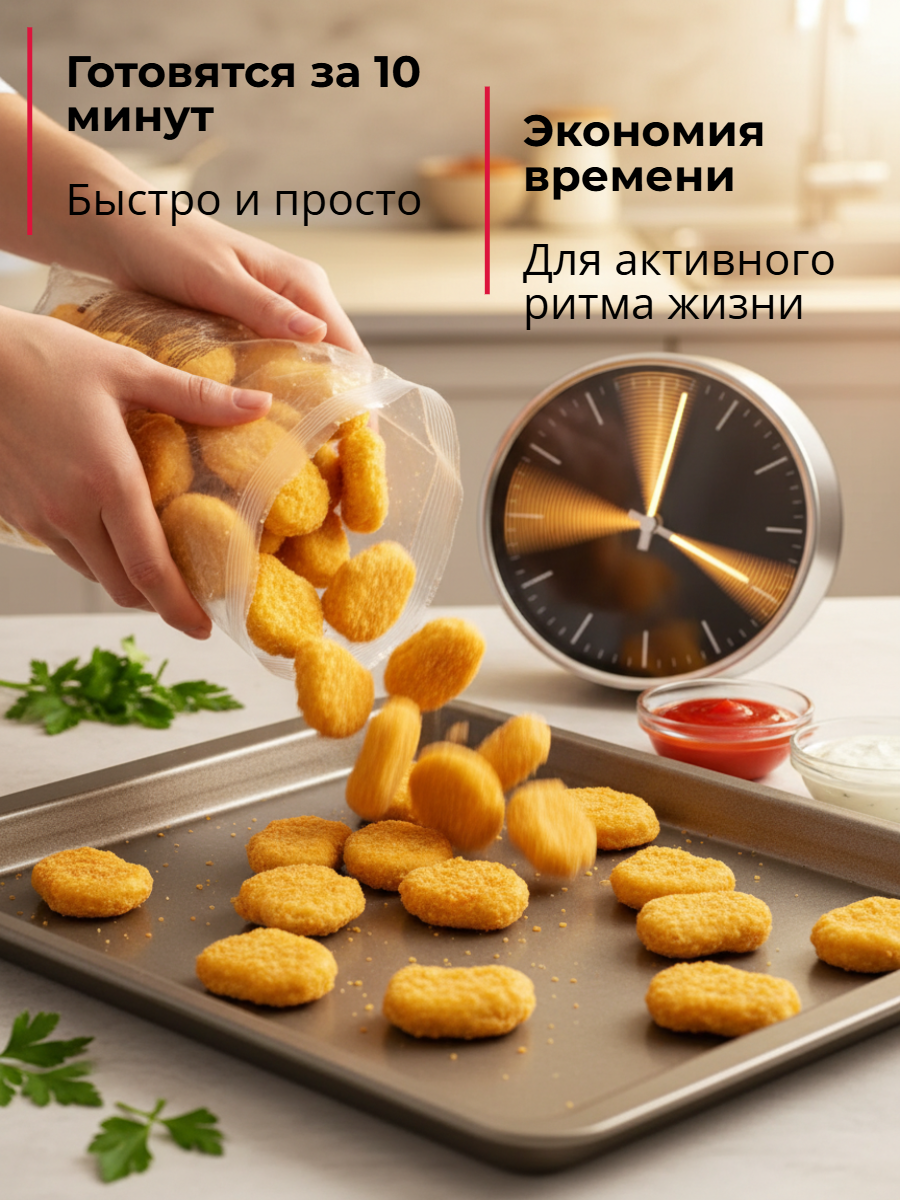 Аппетитные наггетсы в золотистой панировке имеют нежную сочную текстуру, насыщенный куриный вкус с легкой солоноватостью и пряный аромат.