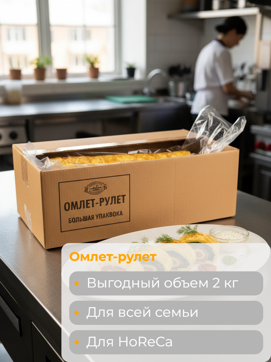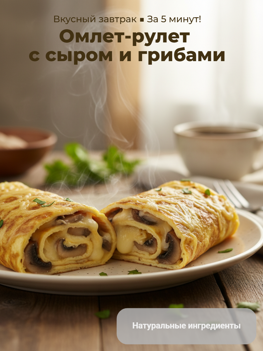 Рулет из нежного омлета с начинкой из сыра и грибов. Внешний слой рулета — равномерный, слегка пористый, желтого цвета пласт, сбоку видна начинка из мелконарезанных грибов и тягучего сыра. Рулет имеет сливочно-солоноватый вкус с легкими пикантными нотами, нежную текстуру и молочно-яичный аромат.