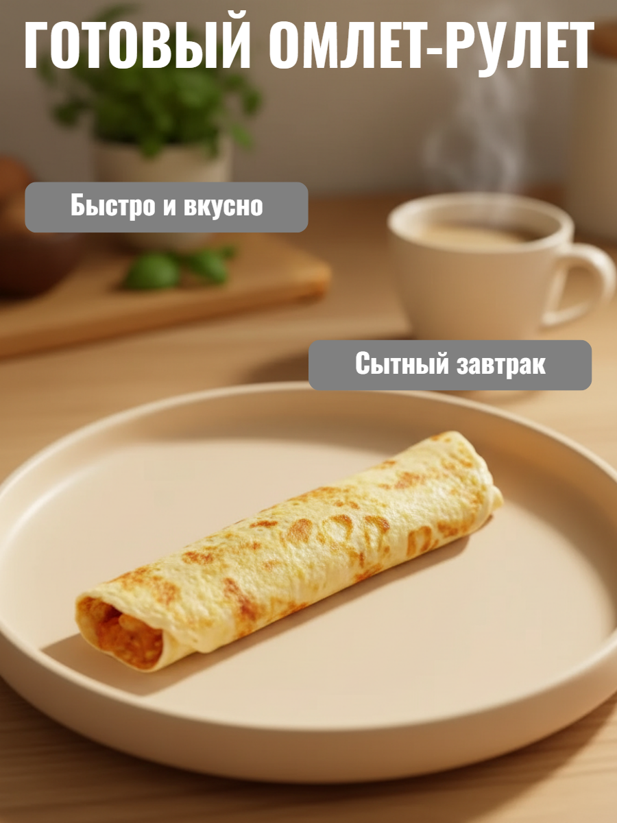 Рулет из нежного омлета с начинкой из запеченной курицы и сыра. Внешний слой рулета — равномерный, слегка пористый, желтого цвета пласт, сбоку видна начинка из мелконарезанной курицы и тягучего сыра. Рулет имеет сливочно-мясной вкус с легкими пикантными нотами, нежную текстуру и молочно-яичный аромат.