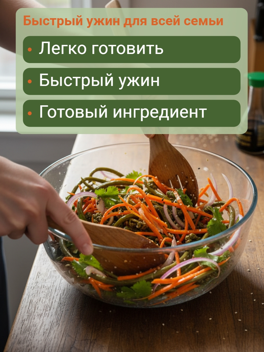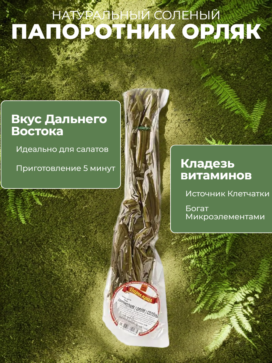 Молодые побеги папоротника Орляк, собранные в экологически чистых регионах России. Папоротник имеет плотную, упругую, хрустящую текстуру, травянистый, соленый вкус с ореховыми нотами и лесной аромат.