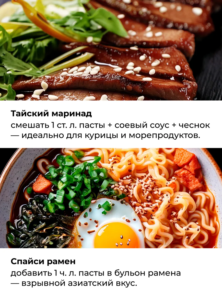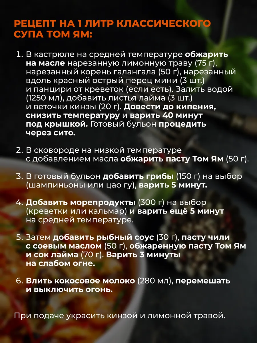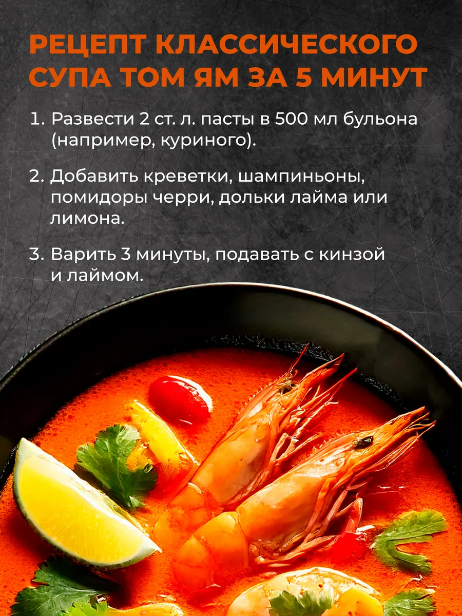 Паста Том Ям используется для приготовления популярного супа Том Ям. Вкус пасты Том Ям - кисло-острый, достаточно острый.