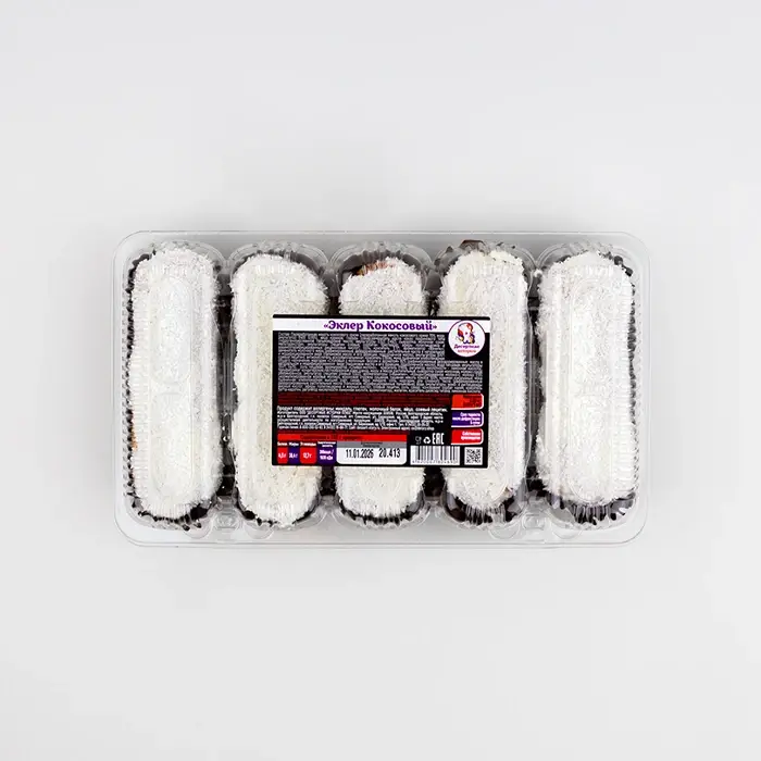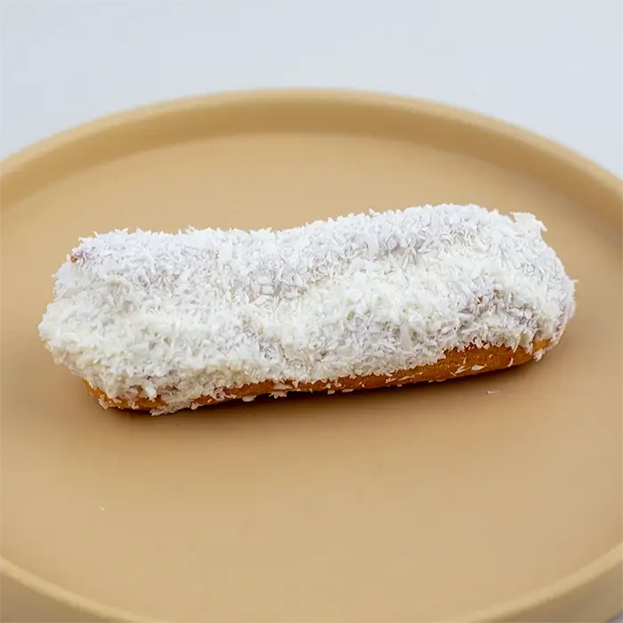Пирожное из заварного теста с начинкой на основе кокосового молока и стружки, дробленого миндаля и слоеной крошки, сверху покрыто белой глазурью и кокосовой стружкой. Эклеры имеют продолговатую форму, воздушную пористую текстуру, сладкий вкус и сливочный аромат.