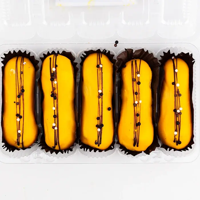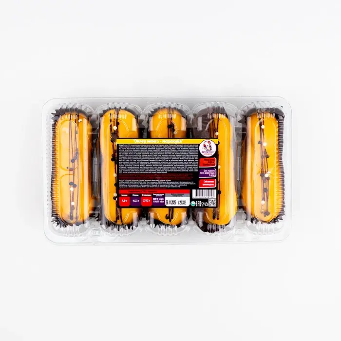 Пирожное из заварного теста с начинкой на основе крема с добавлением пюре манго и маракуйи, сверху покрыто глазурью. Эклеры имеют продолговатую форму, воздушную пористую текстуру, сладкий вкус с легкой кислинкой и тропический аромат.