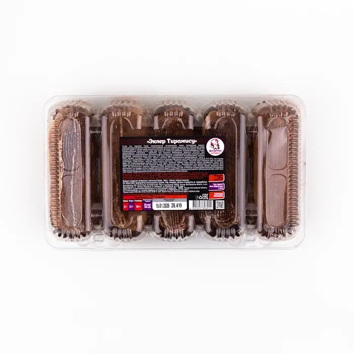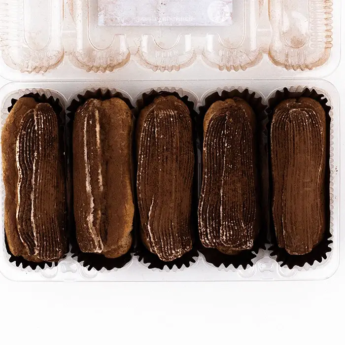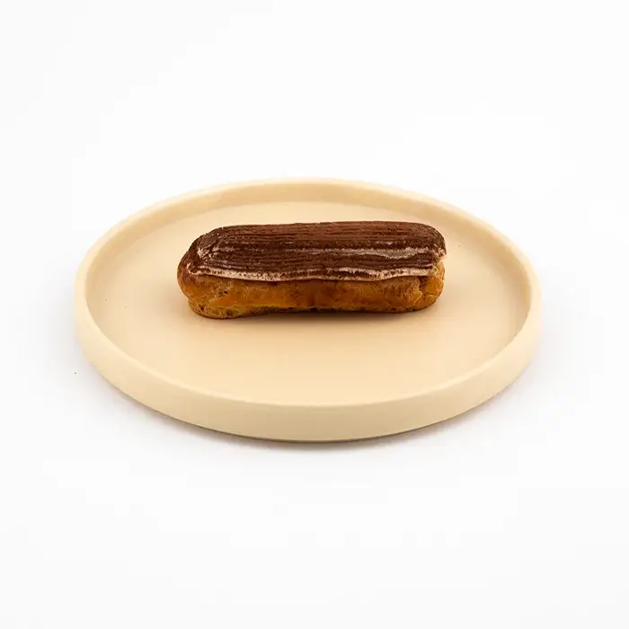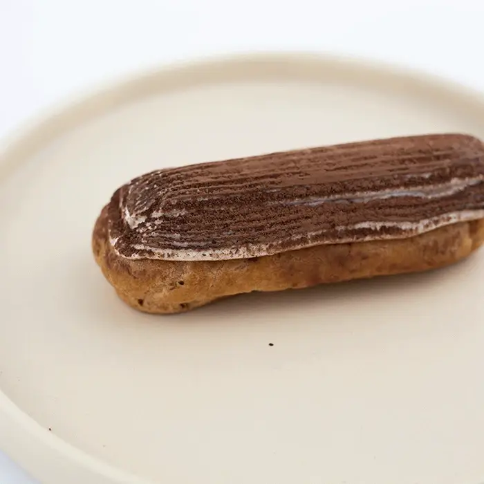 Пирожное из заварного теста с начинкой на основе сливочного крема, сверху бисквит, пропитанный кофейным сиропом и покрытый слоем сырного крема, декорировано какао. Эклеры имеют продолговатую форму, воздушную пористую текстуру, сладкий сливочный вкус с легкими терпкими нотами и кофейный аромат.