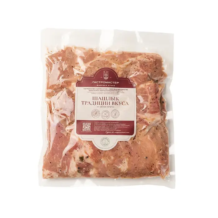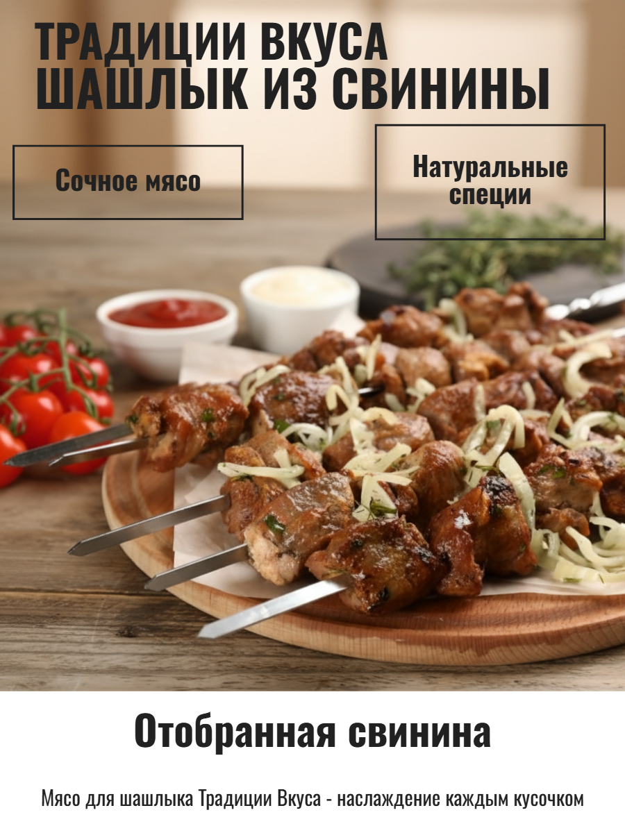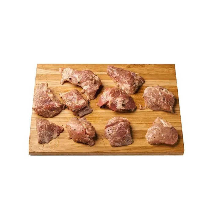 Сочные, нежные кусочки свинины не содержат костей, имеют мягкую упругую текстуру, сбалансированную мраморность, насыщенный мясной вкус с легкой пикантностью и нотами лимона и пряный перечно-лавровый аромат. Маринад размягчает мясо, придавая ему тающую текстуру.