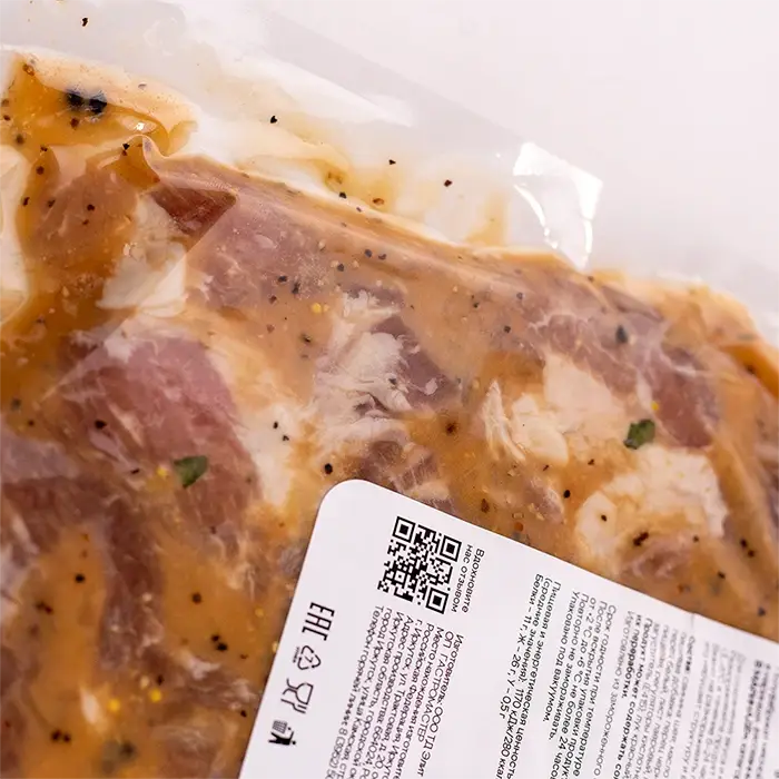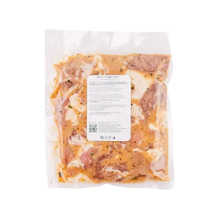 Сочные, нежные кусочки свинины не содержат костей, имеют мягкую упругую текстуру, сбалансированную мраморность, насыщенный мясной вкус с пикантными нотами маринада и пряный аромат. Маринад размягчает мясо, придавая ему тающую текстуру.