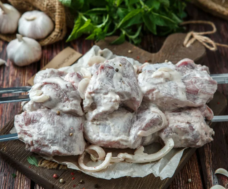 Свиная шея — оптимальный отруб для шашлыка, мясо содержит достаточно жира и соединительной ткани, которые размягчаются при мариновании и жарке, обеспечивая сочность.