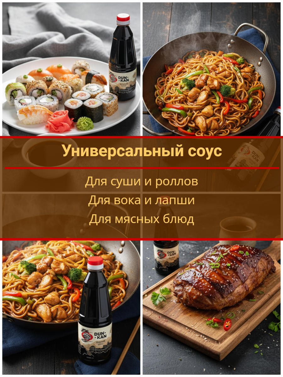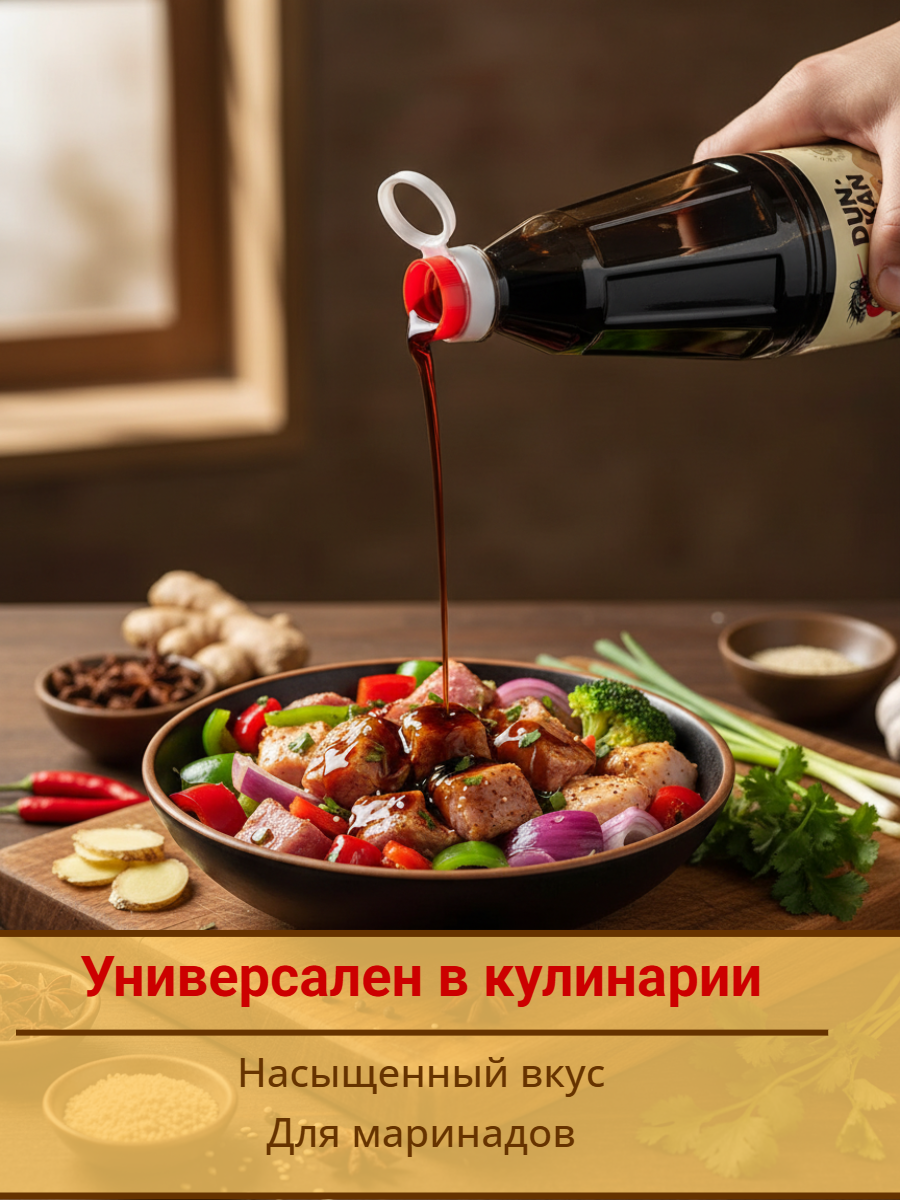 Соус изготавливается из отборных соевых бобов и имеет жидую, однородную текстуру, насыщенный соленый вкус с нотами умами, яркий с карамельными оттенками аромат.