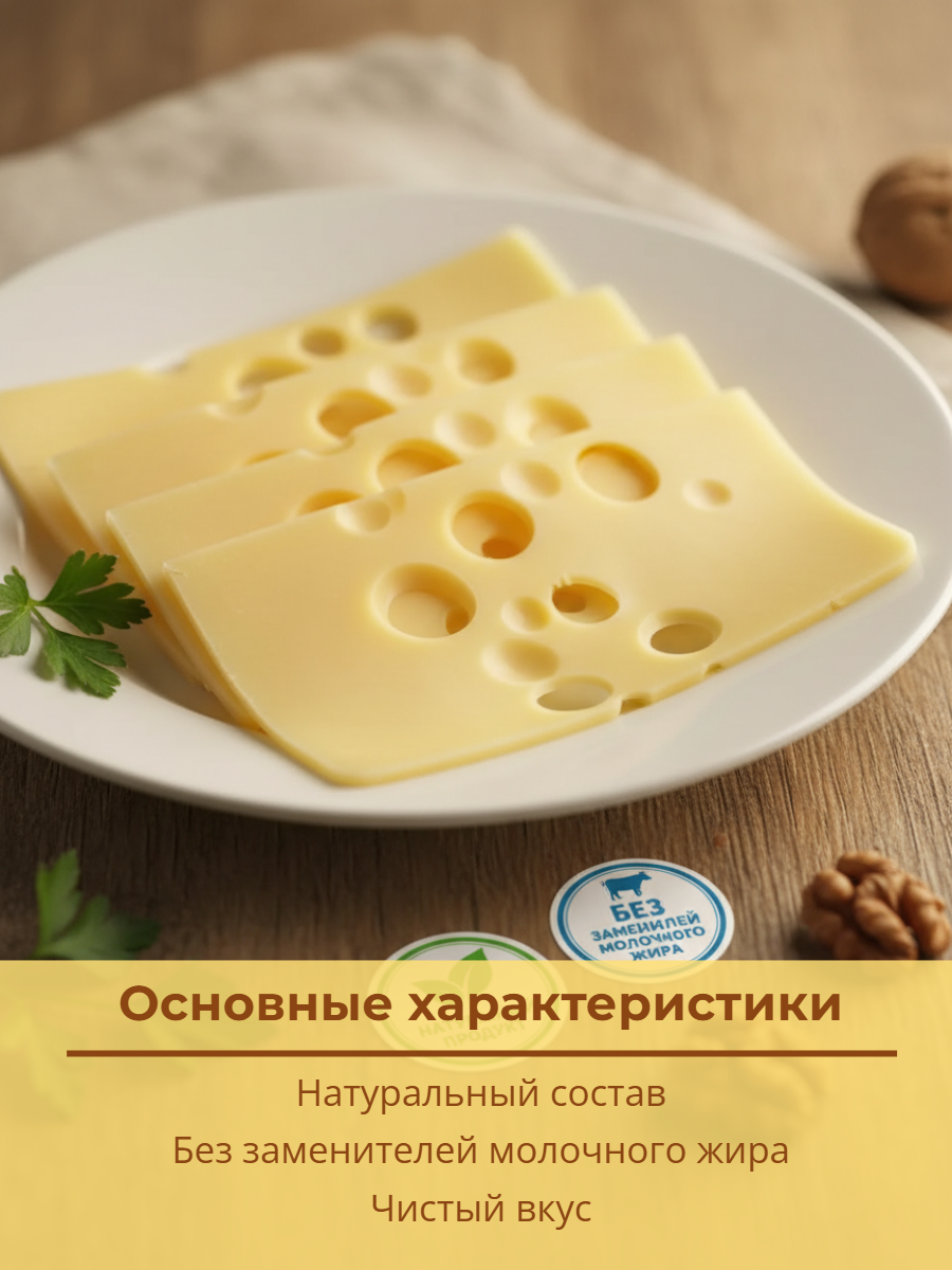 Натуральный сыр с аппетитными крупными глазками имеет сладковато-ореховый вкус, пикантный аромат и гладкую текстуру. Продукт изготовлен из пастеризованного коровьего молока.