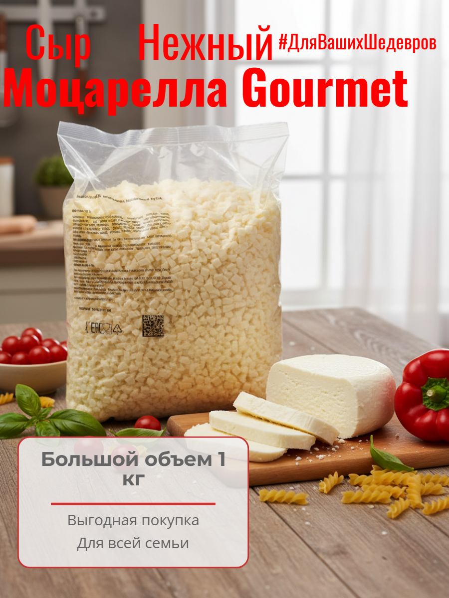 Полутвердый сыр Моцарелла обладает упругой, слоистой и волокнистой структурой, нежным сливочным вкусом с мягкой солоноватостью и чистым молочным ароматом. При запекании равномерно и быстро плавится, хорошо тянется и образует золотистую корочку. Сыр порезан на кубики для упрощения взвешивания и порционирования.
