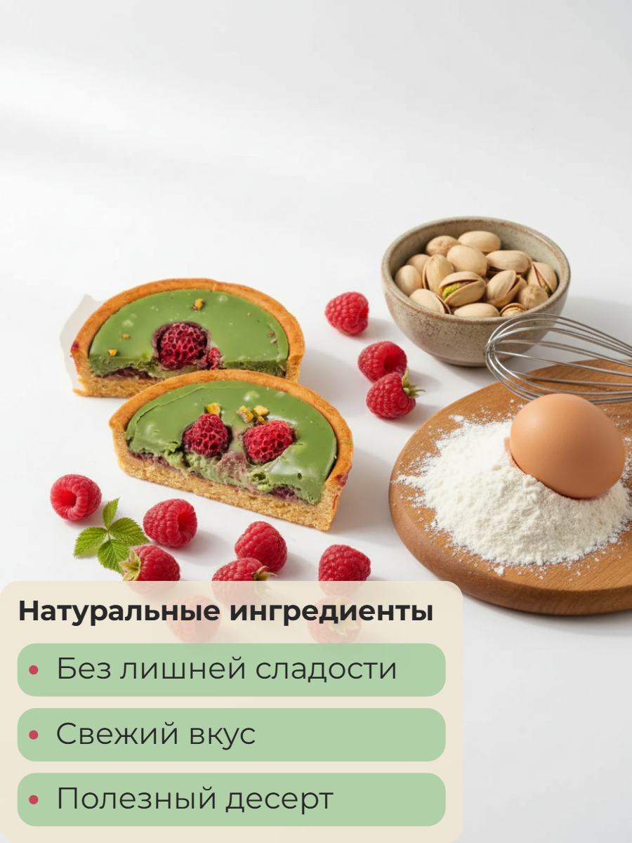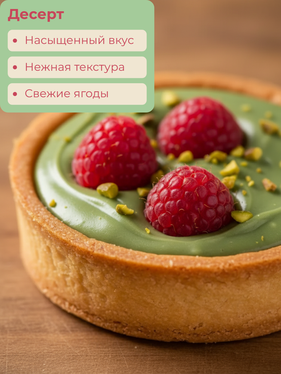 Фисташковый ганаш, малиновая прослойка в корзиночке из песочного теста. Сверху тарталетка украшена ягодами и дробленой фисташкой.