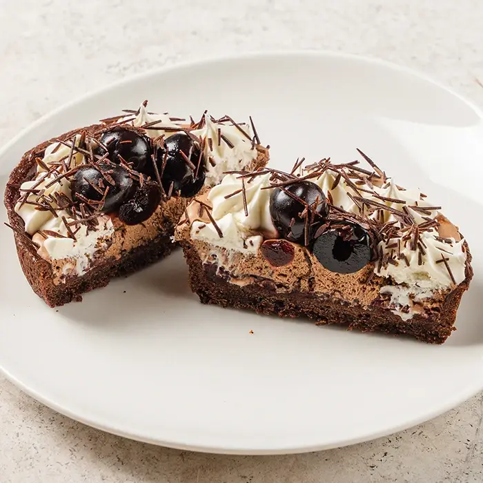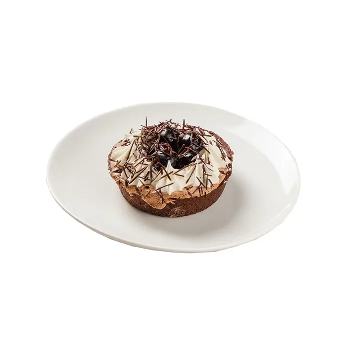 Сладкая корзинка из песочного теста с шоколадным муссом и кисло-сладкой вишневой начинкой. Сверху украшена нежным кремом, вишнями в сиропе и шоколадной посыпкой.
