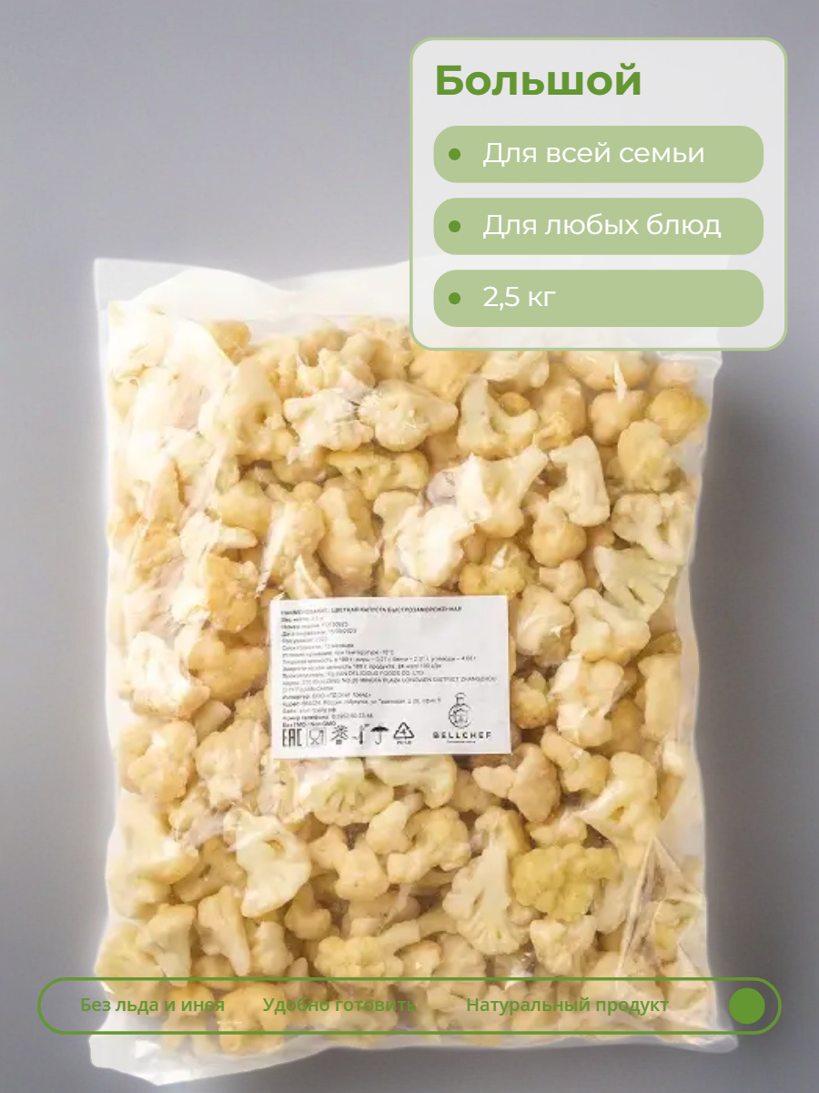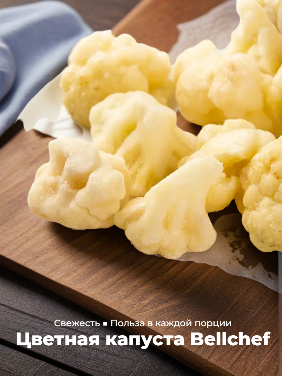 Цветная капуста белого цвета имеет нежную, слегка хрустящую консистенцию, сливочно-ореховый вкус со сладковатыми нотами и свежий растительный аромат. Соцветия не развариваются в кашу.