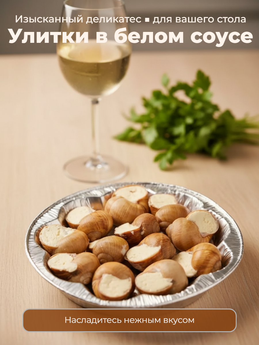Улитки в собственных раковинах, очищенные и наполненные густым, кремообразным соусом светло-бежевого цвета, сливочного вкуса без излишней остроты или кислоты. Улитки имеют нежную, упругую и сочную текстуру.