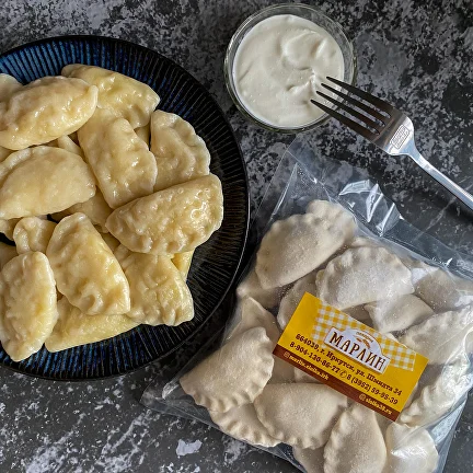 Нежные вареники из тонкого теста, фаршированные пюре из отборного картофеля с обжаренным луком. Баланс текста и начинки даёт классический комфортный вкус «как у мамы».