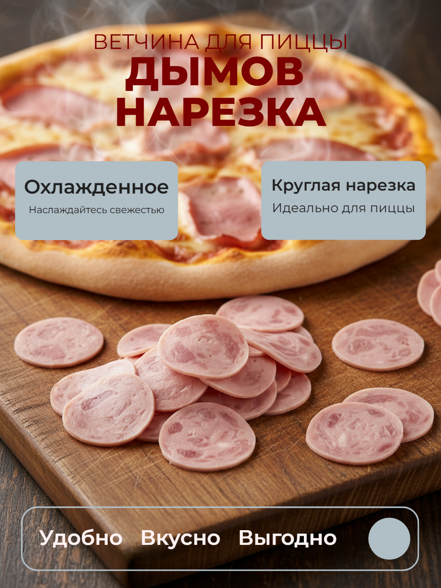 Питательная ветчина из свинины нежно-розового цвета с сочным и пряным вкусом и плотной консистенцией подходит для пиццы и сытного завтрака.