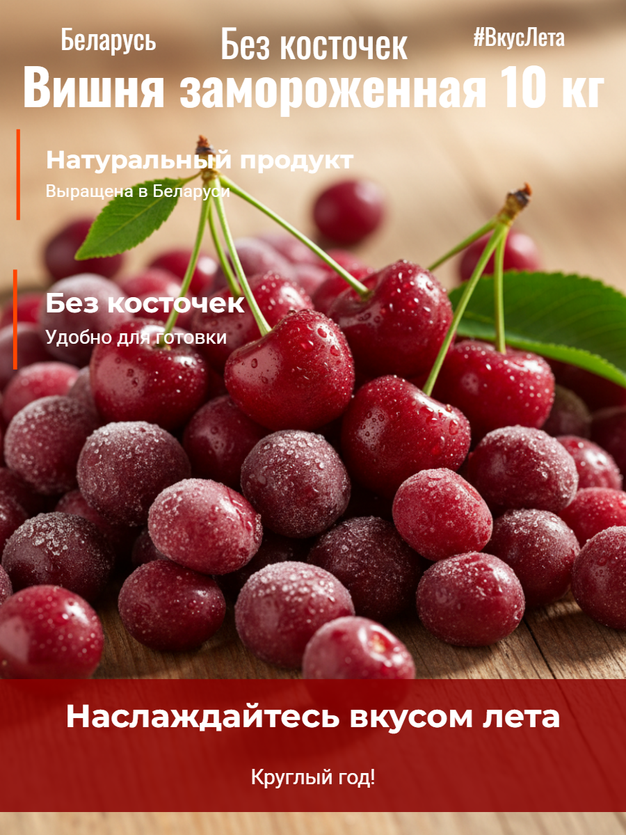 Замороженная вишня без косточки производства Беларусь, предназначена для профессионального использования в кондитерских, пищевых производствах и сегменте HoReCa. Ягода проходит шоковую заморозку, сохраняет натуральный вкус, цвет и структуру после разморозки.