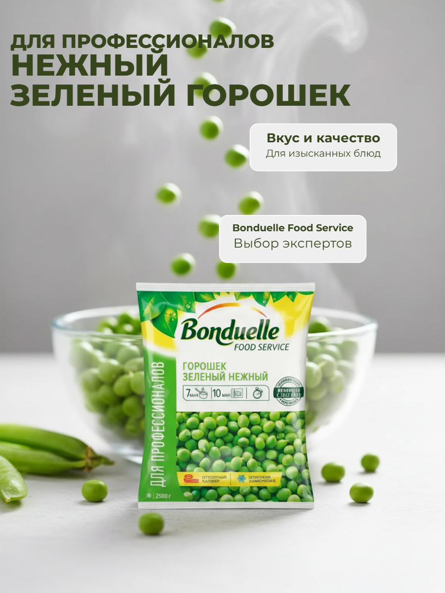 Зеленый горошек имеет нежную и упругую текстуру, ненавязчивый вкус с тонкими ореховыми нотками.